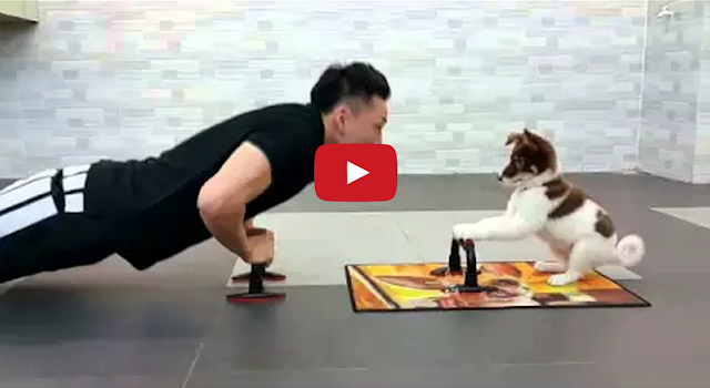 Eric Ko, a dog trainer at the Dogaroo Dog Training Center in Kowloon, Hong Kong, does a set of push-ups with his smart puppy, Teeny.