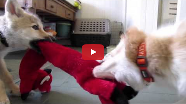 Nikai, a 9-week-old wolf pup, meets Faye, a 13-week-old border collie puppy, for the first time at the Wolf Conservation Center in South Salem, New York. It took the pair a little while to get used to each other, but once they did they became instant best friends and enjoyed some fun roughhousing and games of tug-of-war.