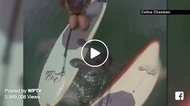 Earlier this week, Celine Chasteen and her friend had a surprise encounter with a friendly manatee while paddleboarding near the coast of Jupiter, Florida. The young manatee clung to Celine’s paddleboard with his flippers for about 30 seconds before swimming on his way.
