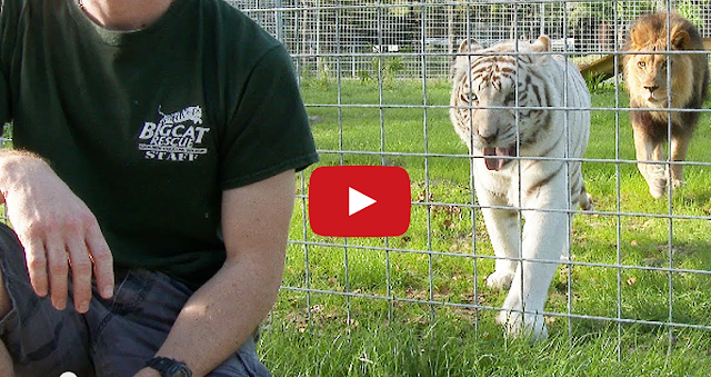 A keeper from Big Cat Rescue in Tampa, Florida, turns his back on tigers, lions and leopards to demonstrate their sneaky hunting instincts.