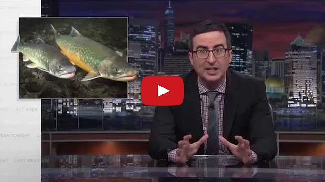 After covering a news story about a real salmon cannon that’s used to get salmon over a damn, Last Week Tonight‘s John Oliver tests out a homemade salmon cannon on a bunch of his celebrity friends, including Jon Stewart, Jimmy Fallon, David Letterman, and Stephen Colbert.