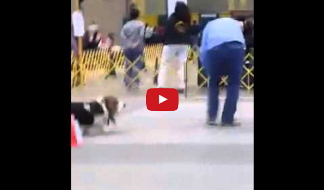 This vertically challenged Basset hound adorably takes his sweet time (and his own route) while competing in an agility competiton at the International Kennel Club of Chicago.