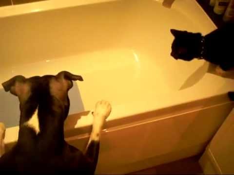 Dog Pushes Cat Into Bathtub