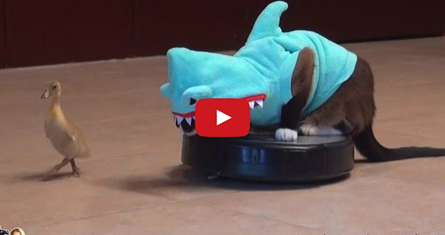 Cat Wearing a Shark Costume Chases a Duckling While Riding a Roomba Vacuum by Tastefully Offensive Shark Cat Cleans the Kitchen [helenspets]