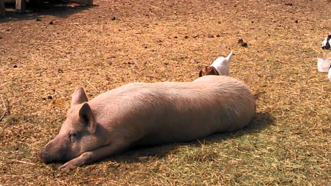 Baby Goat Plays on a Big Pig