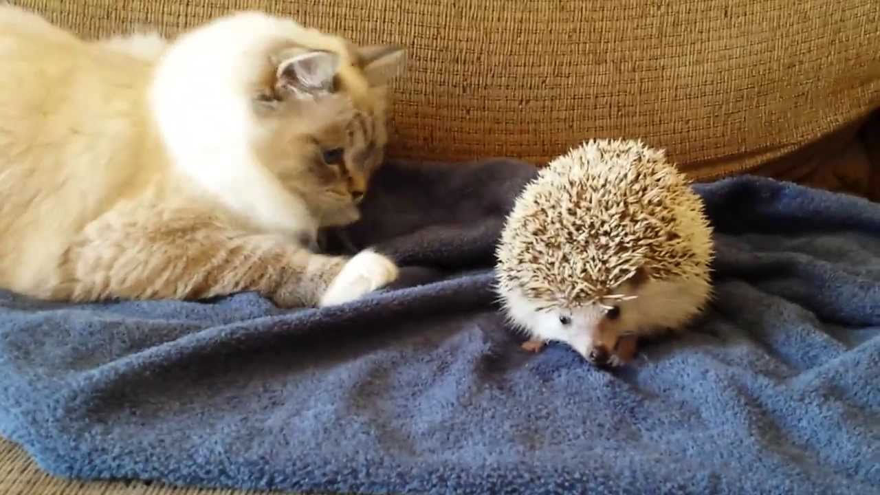 Cat Sits on Hedgehog ByTastefully Offensive September 27, 2013 An 8-month-old ragdoll kitten learns quickly that hedgehogs are prickly. [mamoth100]