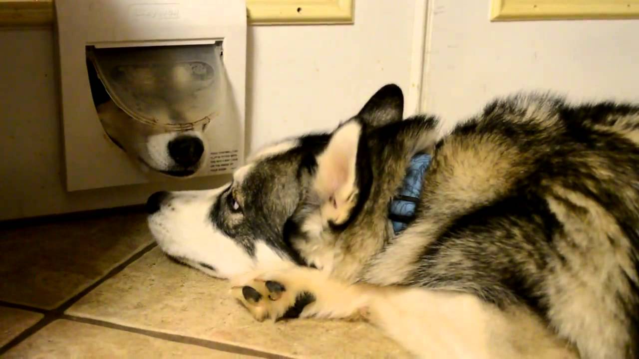 Husky Dogs Argue Through a Cat Door
