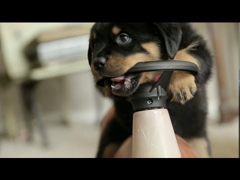 Rottweiler Puppy Rides a Toy Car