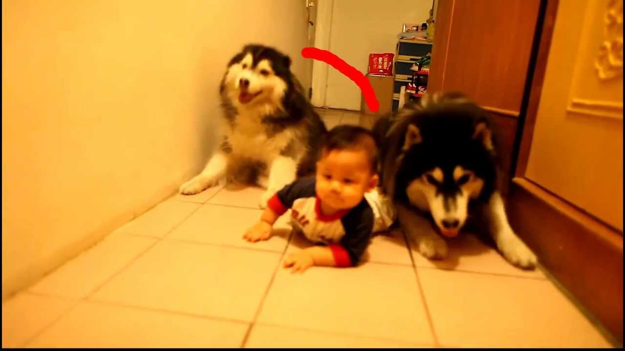 Two Alaskan Malamutes Imitate a Crawling Baby