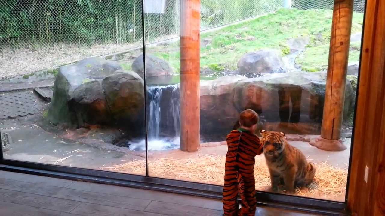 Tiger Cub Plays With a Little Boy in a Tiger Costume