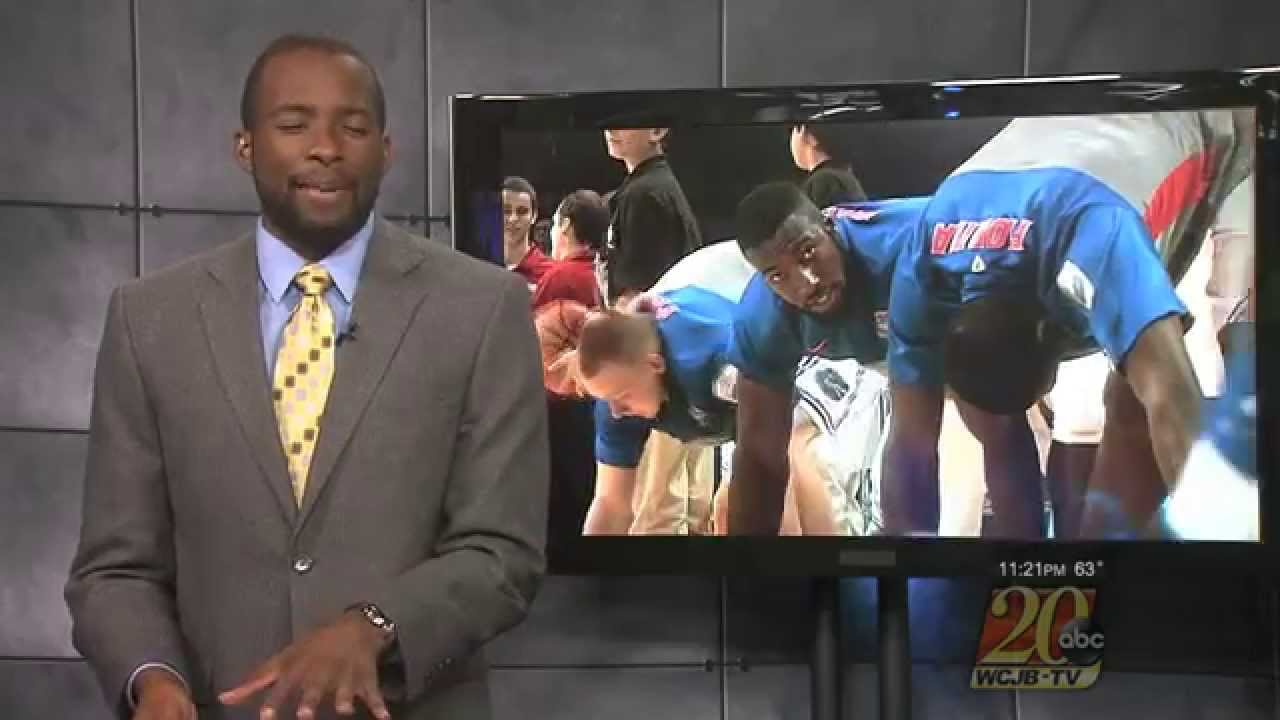 Gainesville sports anchor Zach Aldridge reenacts basketball highlights to get around not having rights to footage from the Dayton vs. Florida ‘Elite Eight’ matchup.