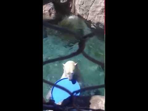 A polar bear tosses his frisbee to a zoogoer at the Rio Grande Zoo in Albuquerque, New Mexico.