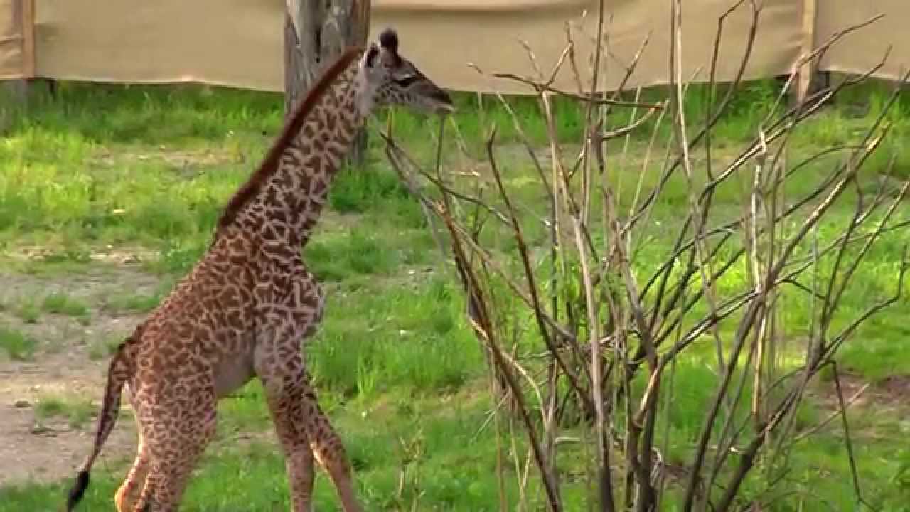 Week-old baby giraffe, Nasha, clumsily explores her public outdoor area for the first time.