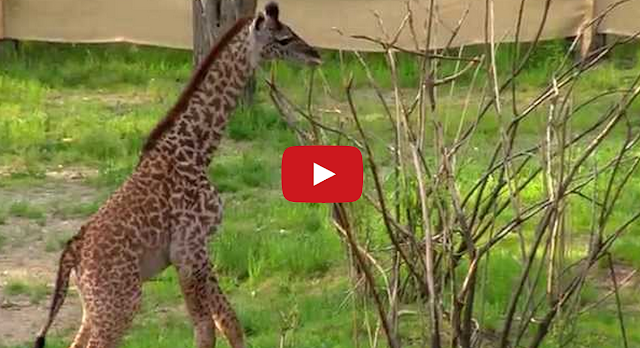 Week-old baby giraffe, Nasha, clumsily explores her public outdoor area for the first time.