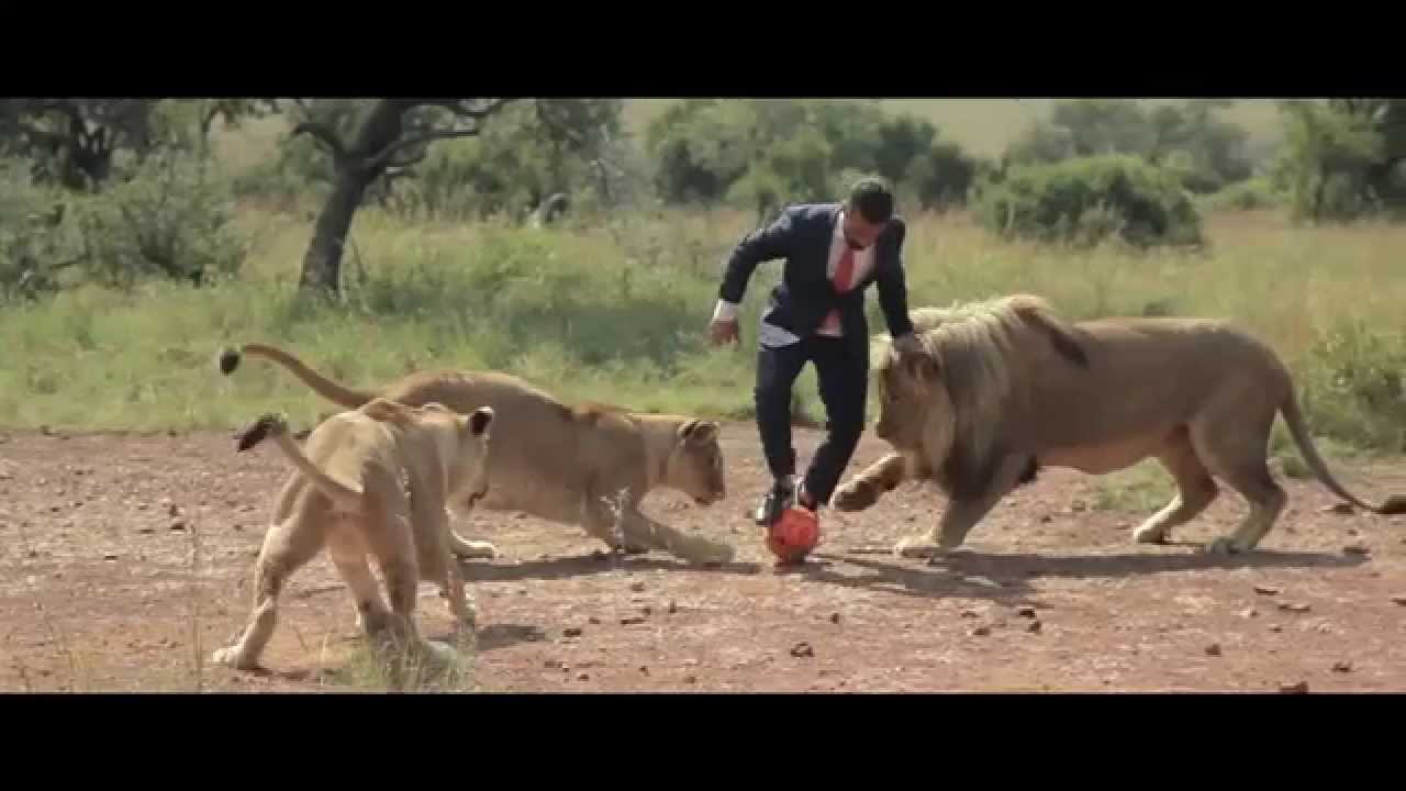 Kevin Richardson, aka The Lion Whisperer, plays football (soccer) with a pack of wild lions in this promotion video for his wildlife sanctuary and Van Gils suits.