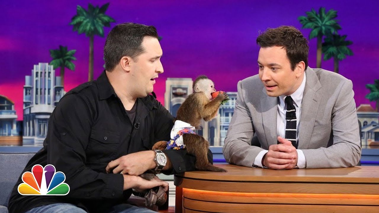 Animal expert Jeff Musial introduces Jimmy Fallon to a baby Capuchin monkey, a white tiger cub, and a father-son albino alligator duo.