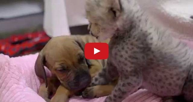 A 6-week-old cheetah cub named Ruuxa gets introduced to a 7-week-old Rhodesian ridgeback puppy named Raina at the San Diego Zoo Safari Park. Raina will be raised with Ruuxa and serve as his lifelong companion.