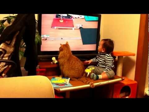Cat and Baby Watch Rube Goldberg Machine on TV Together