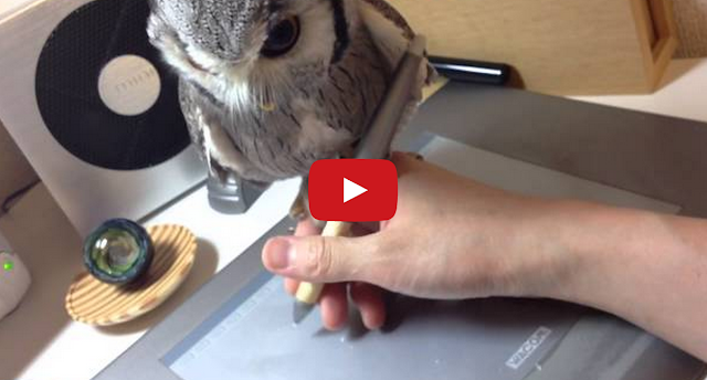 Northern White-faced Owl ‘Helps’ Guy Draw on Tablet
