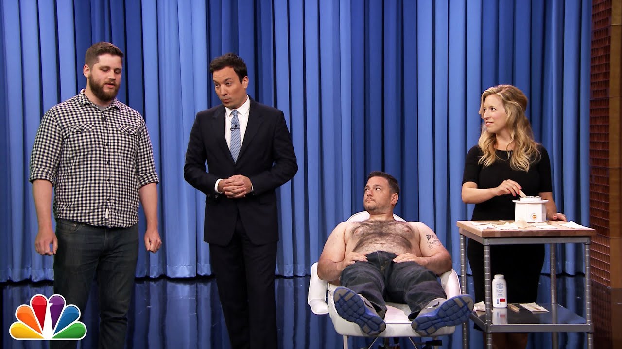 A Tonight Show audience member must rely on his friend to correctly answer challenging trivia questions to avoid a painful chest wax.