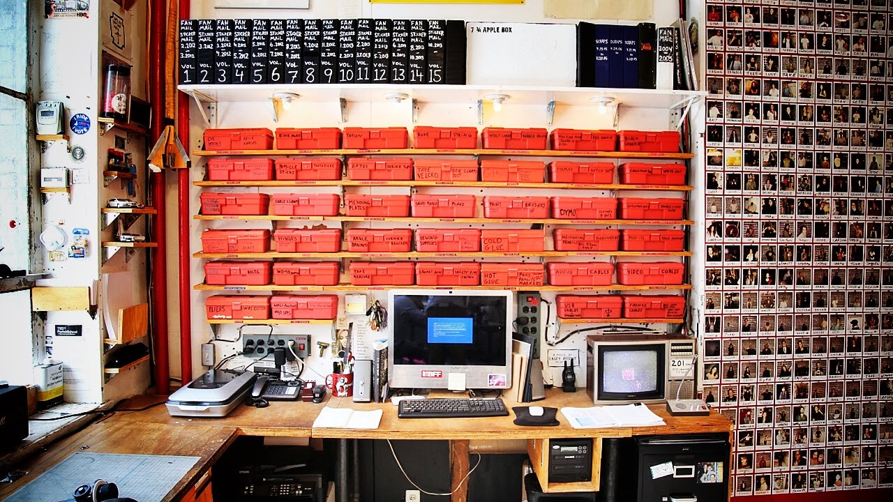 Filmmaker Casey Neistat explains how 39 red boxes efficiently help keep his studio organized.