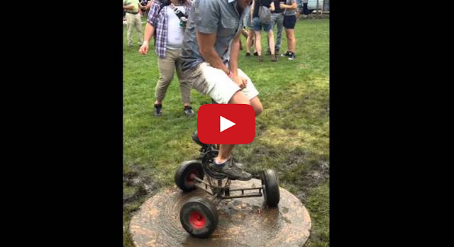 Guy Attempts to Ride a 3-Wheeled Rotating Bike Contraption by Tastefully Offensive 3 wheels, 2 pedals, 1 seat, 0 practical purposes. Filmed at the Tour de Fat festival in Chicago. [stephen sukowaty/via]