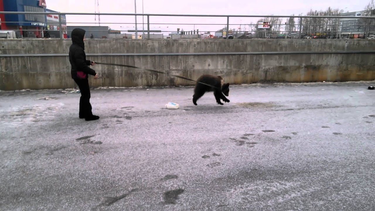 Russian Woman Takes Playful Baby Bear for a Walk