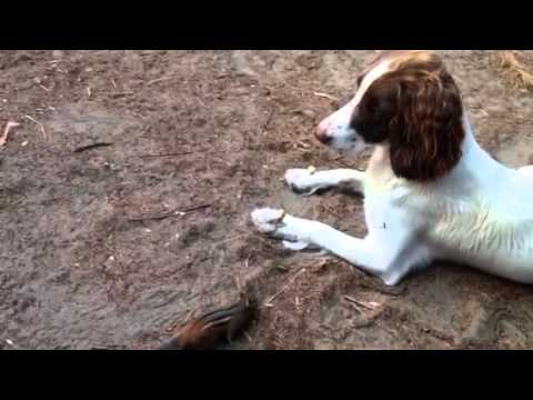 Wild Chipmunk Takes Peanuts from Dog’s Paws
