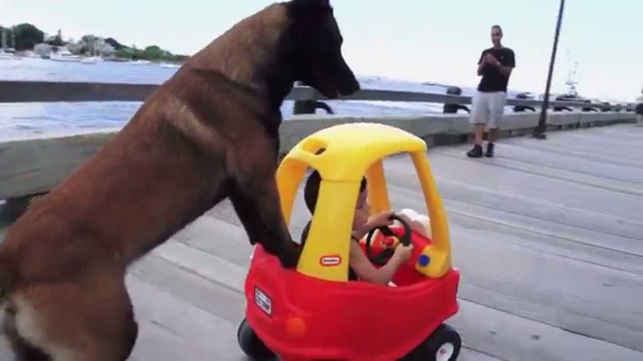 Eteo the Belgian Shepherd Dog pushes 3-year-old Aden around in a Little Tikes Cozy Coupe on a pier in Newburyport, Massachusetts.