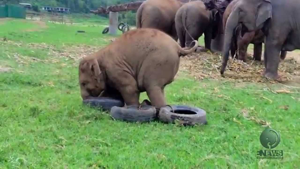 Clumsy Baby Elephants Play With Tires