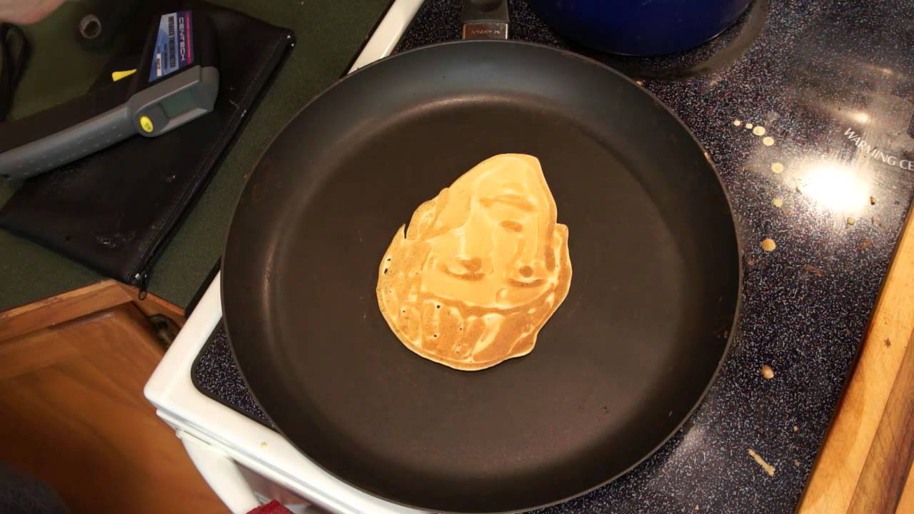 Nathan Shields teaches his kids about The Beatles by creating very recognizable portraits of John, Paul, George and Ringo out of pancake batter.