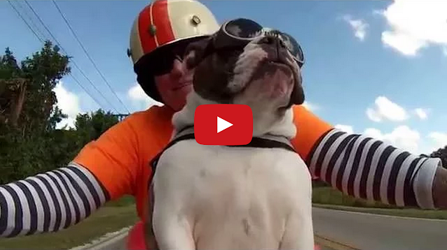 While cruising with her human, Christine Sutton, Sweets the English Bulldog notices a passing biker wave at them and appears to wave back all on her own. In addition to looking the part in her custom doggles, Sweets is also clearly well-versed in biker etiquette.