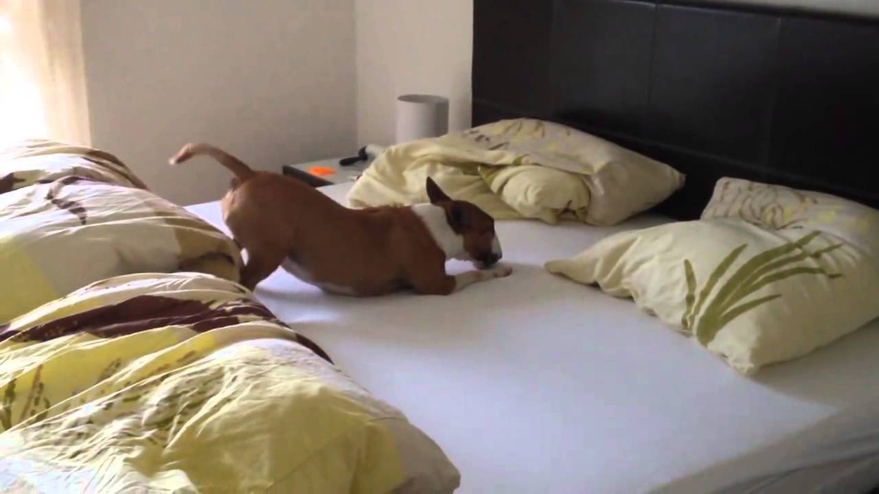 Renate Ernst from Munich, Germany films as his hyper Bull Terrier Lilli getting in some morning cardio on the bed.