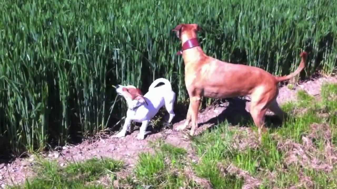 Megan the Lurcher dog has the best day ever bouncing her way through a crop field with her vertically challenged best friend, Molly the Jack Russell Terrier.