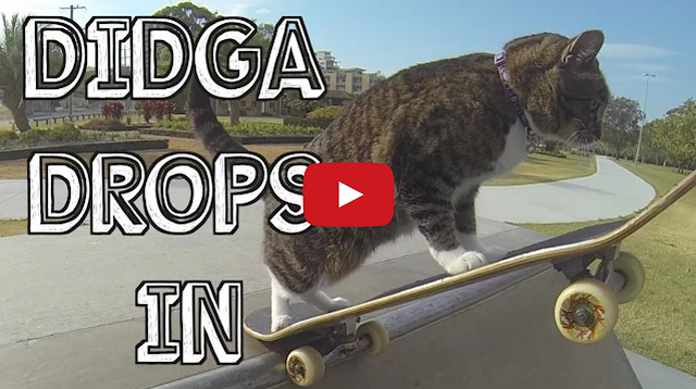 Didga the cat impresses the kids (and dogs) at the local skatepark with his amazing skateboarding skills (with a little help from his human’s video editing skills).