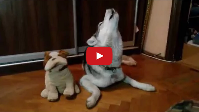 A dog (Husky?) and singing bulldog toy sing a beautiful duet of Louis Armstrong’s “What A Wonderful World“.