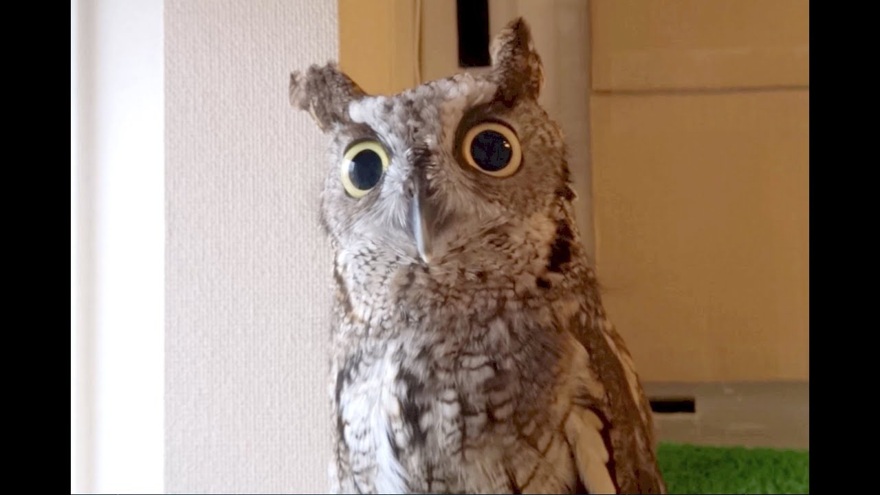 Kuu the screech owl does an impression of the Dramatic Chipmunk meme when he spots a flying crow while staring out the window.
