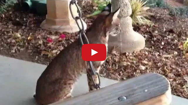 This woman was sitting on her porch enjoying the sunrise when an unexpected visitor sat down beside her. A cute little bobcat was within a couple feet of her and seemed to also be taking in the nice view, without even realizing she was there. After thinking he was alone for almost a full minute he finally notices her, and with a look of surprise sneaks off back into the trees.