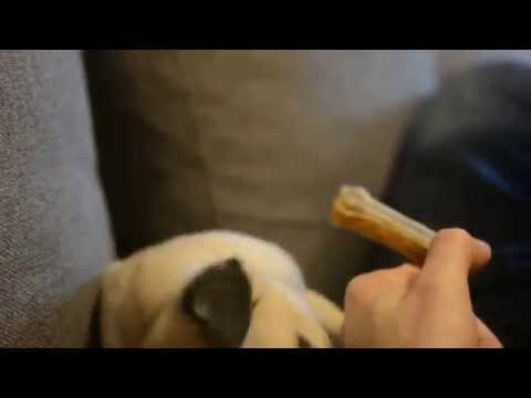 Knefel the pug puppy throws an adorable little fit when his human offers him a bone to chew on.