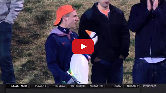 During yesterday’s college football matchup between University of Miami’s Hurricanes and University of Virginia’s Cavaliers, a Cavaliers fan caused the announcers to lose it when he started singing Journey’s “Don’t Stop Believin’” to his plastic goose.