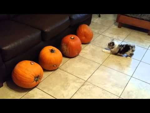 Tiny Puppy vs. Pumpkins ByTastefully Offensive November 6, 2014 A fearless little Australian shepherd puppy shows four big pumpkins who’s boss. [soulspacevoid/via sayomg]