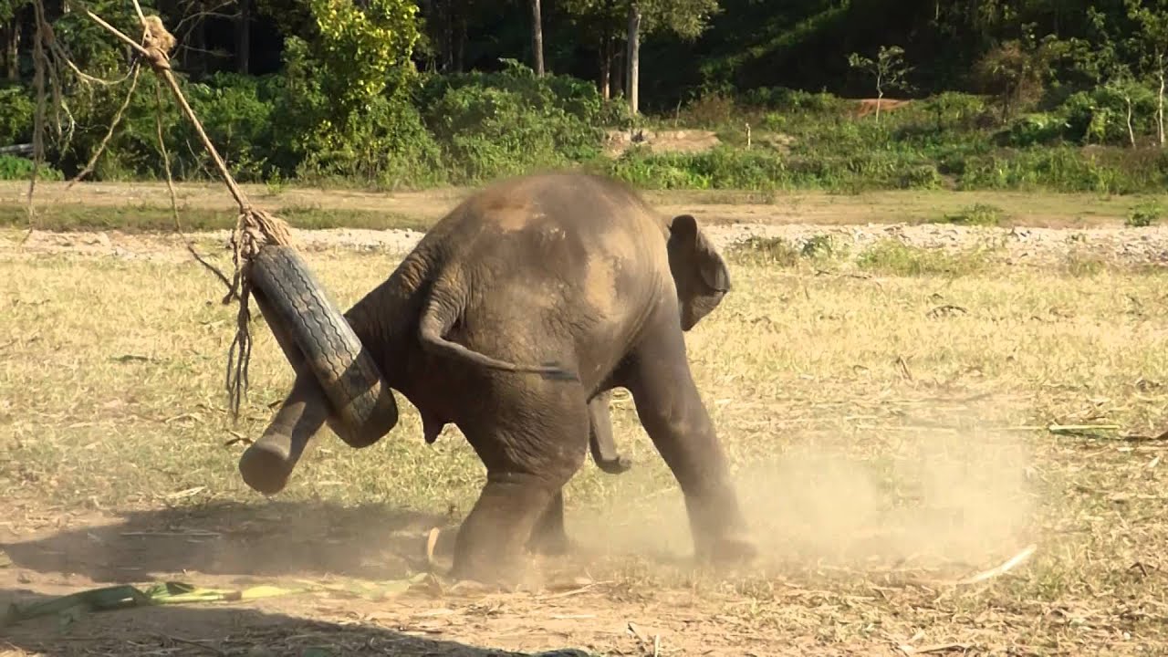 Clumsy Baby Elephant Briefly Gets His Foot Caught in Tire