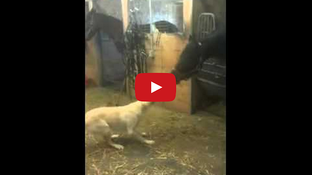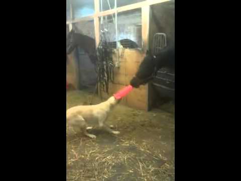 A playful horse and a golden lab engage in a friendly game of tug-of-war over an old traffic cone.