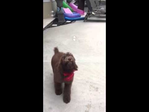 Rug the labradoodle leaps and swallows a bubble while being filmed in slow motion.