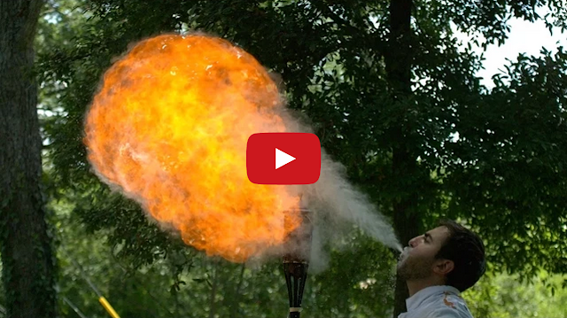 Fire Breathing in Slow Motion by Tastefully Offensive The Slow Mo Guys, Gavin Free and Dan Gruchy, film slow motion (1600fps) fire breathing by blowing corn starch into a tiki torch. Previously: Non-Newtonian Fluid in Slow Motion [theslowmoguys]