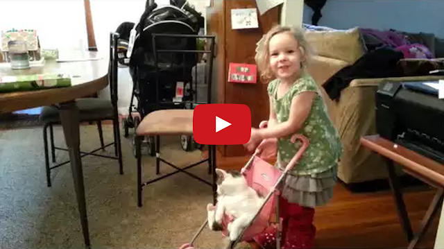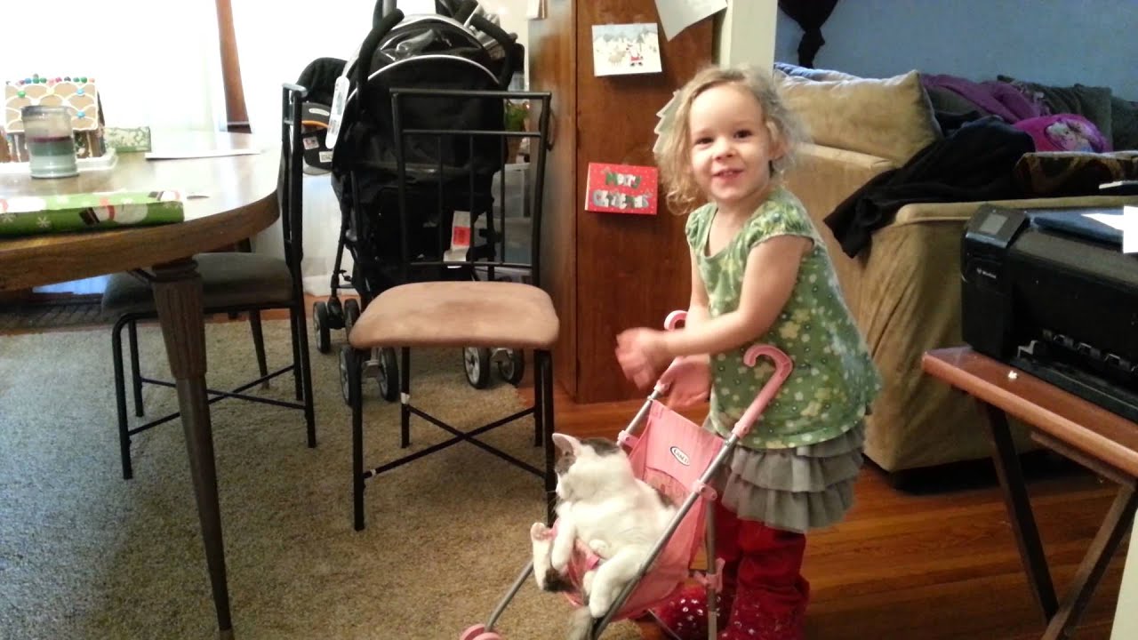 Little Girl Pushes Cat Around in Doll Stroller ByTastefully Offensive December 31, 2014 Baylee pushes her very tolerant cat Monster around in a stroller like a baby. [mike jordan]