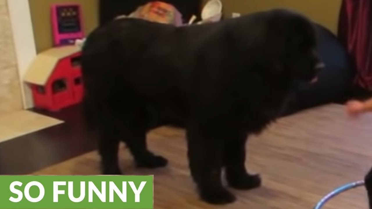 Little Girl Tries to Teach Her Huge Dog How to Hula Hoop