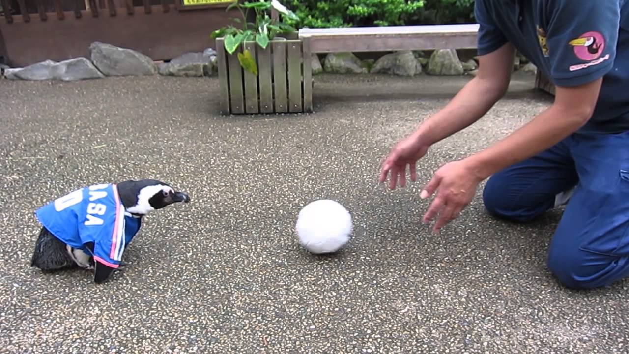 Tsubasa-kun the penguin shows off his impressive soccer skills while wearing an adorable little jersey at the Matsue Vogel Aviary Park in Shimane, Japan.