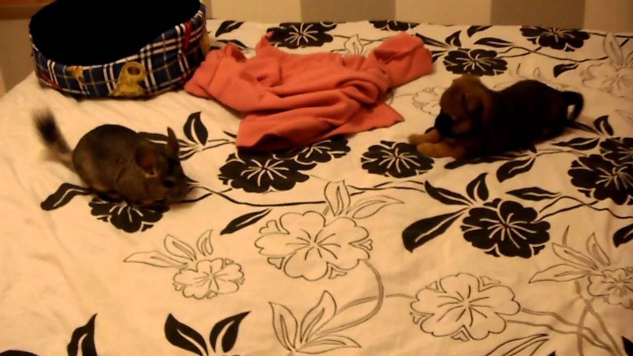 Puffy the puppy meets a chinchilla and they become instant best friends. Notice how the puppy’s tiny tail stops wagging whenever the chinchilla jumps off the bed.