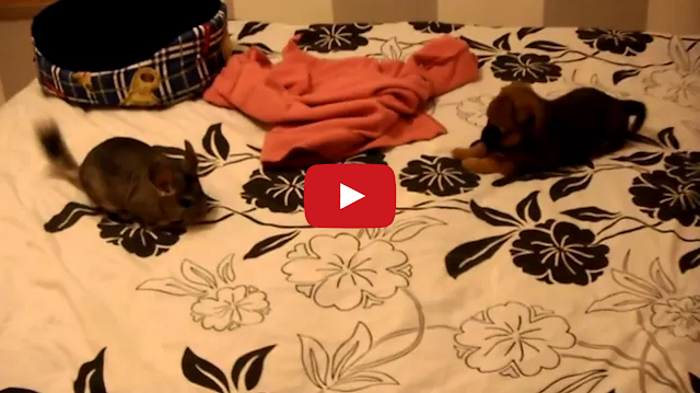 Puppy and Chinchilla Meet for the First Time by Tastefully Offensive Puffy the puppy meets a chinchilla and they become instant best friends. Notice how the puppy’s tiny tail stops wagging whenever the chinchilla jumps off the bed. [avram behar/via semsr]
